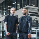 Vier junge Erwachsene stehen im Freien, lächeln und tragen passende schwarze "KNAPP Crew"-T-Shirts.